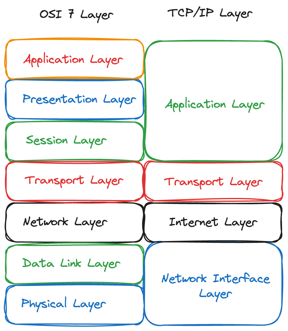 일반적으로 네트워크를 7개의 계층으로 바라보자 라는 시각으로 OSI 7 Layer을 만들었어요. 각각의 계층은 그림에서 보다싶이 Application Layer, Presentation Layer, Session Layer, Transport Layer, Network Layer, Data Link Layer, Physical Layer로 구성되어 있다. 다만 실제로는 위와 같이 쓰이지 않아요. 그렇다면 왜 이것을 공부할까요?